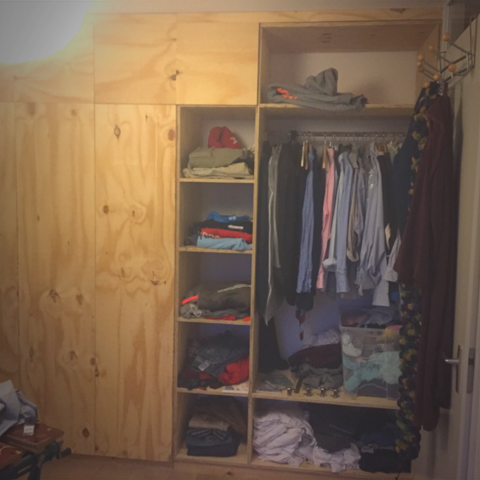 In 2016 wilde ik een houten (kleding) inbouwkast maken in onze slaapkamer (eerste eigen huis), met veel bergruimte en hang gedeelte. Het voordeel van een inbouwkast is dat deze van de grond tot het plafond kan lopen waardoor de gehele muur bedekt wordt met zeeën van kastruimte. Daardoor heb je geen last van spullen die in het zicht staan of stof boven op de kast.